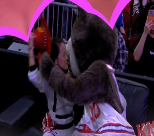 火箭主场迎战马刺,暂停是kiss cam环节,镜头给到一位穿着马刺球衣的球迷和他的女伴,随后火箭吉祥物火箭熊叫来保安“逮捕”这位球迷,并和他的女伴热吻。